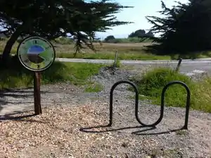 The graphic design disc showing Carbon footprint was mounted on a 22 inch bicycle wheel. Spokes were removed from one side of the hub to make the outer rim and disc flush. The design was created using a combination of Adobe Image ready and Photoshop. The Duneheads designed the wheel to compliment the natural aesthetic of the dunes. Colors were chosen to correspond with the various carbon footprints and with the site's surroundings. The friends of the dunes logo's are printed on the front cover.