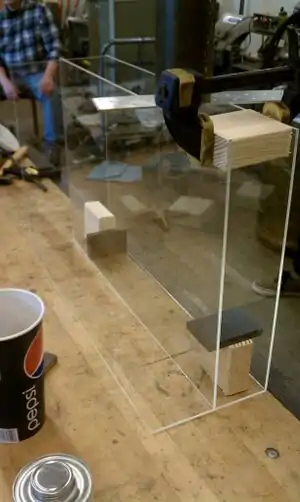 - Our first step in construction was to build the acrylic tank. We used scratch-resistant acrylic sheets and attached them using acrylic glue, and we used clamps and spacers to hold the sheets together while the glue dried. Initially the scratch-resistant coating resisted the adhesive properties of the acrylic glue, so we had to carefully use sandpaper to remove the coating on the edges of the sheets where they joined with other sheets.