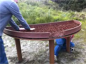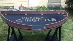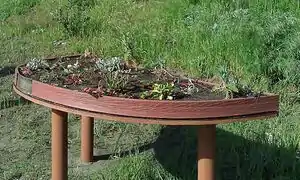 The scale model of the green roof consists of a half-circle table that is six feet in diameter, four feet in radius, and supported by three wooden posts that are secured to concrete blocks buried in the ground. It is installed on the Living Green Interpretive Trail in front of the nature center. Beside the model is an informational sign that explains what green roofs are and the benefits they have.