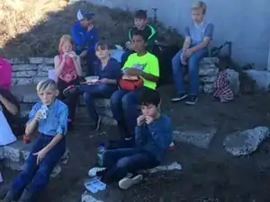 The amphitheater that is used by students that are on field trips. It is used weekly if the weather allows it. It is evident that it needs some maintenance. Weeds need to be picked and some sand must be added to the stairs.