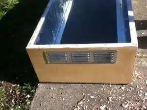 The main solar dehydrating unit is made from a pine box with dimensions of 12"X49"X24" with a wall depth of 0.5". There is an acrylic plexiglass face with a bottom opening door. There are 2 dehydrating screens for the food to dehydrate on. There are also two vents on opposite sides, with one vent on the bottom near the door and the other vent near the top of the plexiglass window.