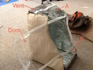 Figure 7: The back bottom and trimmed sides in the frame. (Photo by Sarah Morton) - The front face consists of two vents at the bottom and the top and a Velcro door. The vents at the top and the bottom can be 1” to 4” tall, depending on the venting desired, by the width of the backpack. Cut the screening material 1 ½” longer than the width of the backpack. Cut a piece of plastic the exact width of the backpack and ¼” longer than the screen height. Center the plastic on the screening and line along one length edge. Pin in place about ¼” from the lined up edge and sew the two pieces together using ½” seam. Remove the pins. Repeat steps for the other vent.