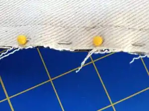 Figure 4: A seam pinned together. (Photo by Sarah Morton) - Line up one of the sides to the back of the unit along their seam edge. Place them flat against each other so that the canvas faces are touching each other and the insulation is facing out. Makes sure the side extends ¾” past the seam from the back and the bottom, this makes for a nicer seam between the sides and the bottom pieces. Pin the back and side together along the seam about ¼” from the edge. Using the sewing machine sew the two pieces together along the outer edge about ½” from the outside edge. Repeat this process with the other side panel. Pin the sides to the bottom along the seam about ¼” from the edge. Using the sewing machine sew the two pieces together along the outer edge about ½” from the outside edge. Repeat this process with the other side panel. Makes sure to sew them so that the canvas pieces are again touching and the insulation is faced out.