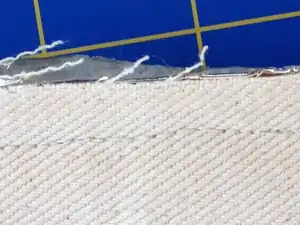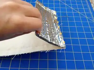 Figure 3: Insulation and Canvas sewn toghther. (Photo by Sarah Morton) - Line up the back and the bottom pieces along what is to be their seam. Place them flat against each other so that the canvas faces are touching each other and the insulation is facing out. Pin the bottom and back together along the seam about ¼” from the outside. Sew the two pieces together along the outer edge about ½” from the outside edge. Remove the pins.