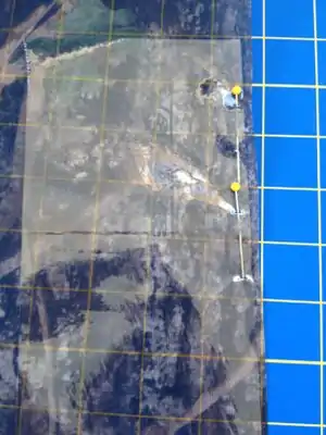 Figure 8: The plastic pinned to the screening for vent. (Photo by Sarah Morton) - Measure the remaining distance to cover the face of the backpack and add 5”. Cut out a piece of plastic that size by the width of the backpack. Cut a 4” wide piece of clear plastic. Cut a piece of clear plastic the desired size of the door, make sure to consider that it must be large enough to insert and remove the drying tray. Line up the plastic on sewn to the vent and the door along the width side. Sew the door to B on the left hand edge. Pin and sew the B to the other vent. Overlap the two lengths ¾”, the width of the Velcro. Hand sew the two pieces along the left hand side where they meet (door opens to the left) right along the edge. Measure the remaining distance necessary then cut that distance from the remaining plastic seen at A. Cut a 2" piece of plastic by 2" longer than the door. Align with the right hand side of A and B overlapping each by 1". Sew into place. You should now have one continuous face. Now attach the sticky Velcro to the door seams. Pin and sew the face on the backpack