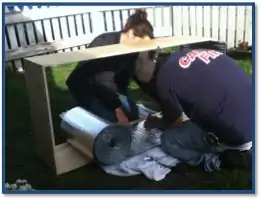 Figure 7: - Make the bottom access door. Put the reflective insulation on the door with adhesive and then then use the duct tape once again to seal edges. Use staples to keep aluminum screening in place before wrapping the wooden dowels. After wrapping one piece of wood, screw it in to the door. Stretch the Aluminum screening as tightly as possible, and roll the screening around wood again, and screw down second side. You want the screening to be about 2-3 inches away from the edge of the door. (Photo by Leabeth Peterson)