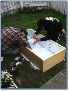 Figure 6: Assembled back bottom and sides in frame. (Photo by Sarah Morton) - Trim both sides to prevent excess shadowing of the interior. Measure out desired dimensions to be removed that best fit the frame used. Mark on the insulation the areas that are going to be removed. Once marked pin the insulation to the canvas a ¼” to the inside of the trim mark. Using scissors cut off the excess material. Use the sewing machine and sew ½”seam along the pins. Remove the pins.