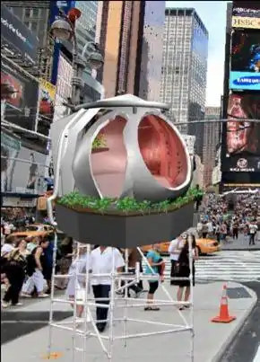 As urban populations continue to grow at exponential rates, sustainable living practices must progress to meet basic human needs. The need for sustainable living practices inspired our client, Mary Mattingly, to create the Flock House mobile art project. Evolving beyond the limits of the typical urban development, Flock House pods have the capability of migrating and inhabiting any unused space. From the sides of buildings to sidewalks, the exact location is only limited to the imagination. The “Flock Pods” are intended to be renewable homesteads. Most food and energy needs will be generated through the “Flock Pods” internal system, and the rest through community support. To meet the energy needs of the inhabitants, each pod is geared with a bike powered energy source (Geared Up From the Feet Up), and a Flock House Handcar Generator. Launching on May 1st, 2012, the first Flock House pod will move through New York’s Lower Manhattan neighborhood (view the entire schedule).