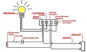 The electronics used in the Geared-Up design are a 36 volt DC motor, a 15 amp fuse and fuse holder, a 40 amp blocking diode, and a 12/24 volt charge controller all wired in series to a 12 volt deep-cycle battery using 12 gauge copper wire. There is also a 12 volt DC light bulb screwed into a light socked which is wired in parallel through the charge controller, used to expend our excess load from the charge controller after charging the battery.