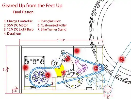 This design is built using an adjustable bicycle trainer stand, a DC motor, a charge controller, BMX bike sprockets, a single-speed BMX chain, a derailleur, and electrical components necessary to power a 12 volt battery all enclosed in a plexiglass box.
