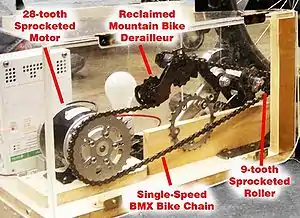 The roller rotates a single-speed bike chain which is attached at the end of the roller and then to the motor. Because the stand is adjustable to different tire diameters, and our motor is screwed into place on a base board, it is necessary to use a tensioner to ...do its job. We repurposed a used derailleur to act as a tensioner for the chain. This adds ease of use to the system.