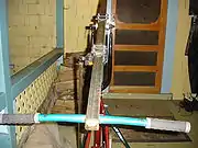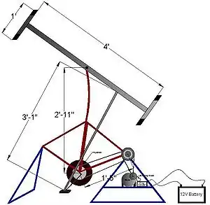 The lever arm consists of a metal bar with an old bicycle handle bar attached to each end. The lever arm rests on a rotating axis that was constructed from the front wheel hub of a bicycle. The arm is held in place by two u-bolts that are inserted through two metal rectangles which are welded onto the center of the lever arm. Through this process and axis of rotation is created for the lever arm. Also attached to the lever arm in an almost identical fashion is the unused pedal from the other side of the bicycle. As the lever arm rotates on its axis it powers the lever bar.