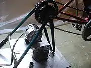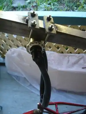 Removing the front forks and stripping off the handlebars, wheel, and all braking/shifting components allows for the forks to be inverted and inserted in the location for the seat. This creates an upright support to secure the lever arm as well as supplying us with an already manufactured spinning axle between two supports. As for a lever arm, a square steel bar can be used and a round steel tube can be used as a shaft to run to the rotating pedal. With this design, a triangular base with the gears and chains and a shaft and lever arm setup are created. This also completes the setup for a lever arm generator made mostly from bicycle parts.