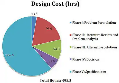 The cost of the design is measured in number of hours, represented in the chart to the right. The chart is distributed by number of hours spend in each phase of the design process. A total of 499 hours were spent in the entire design process.