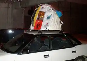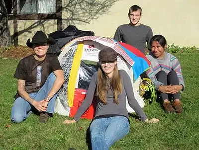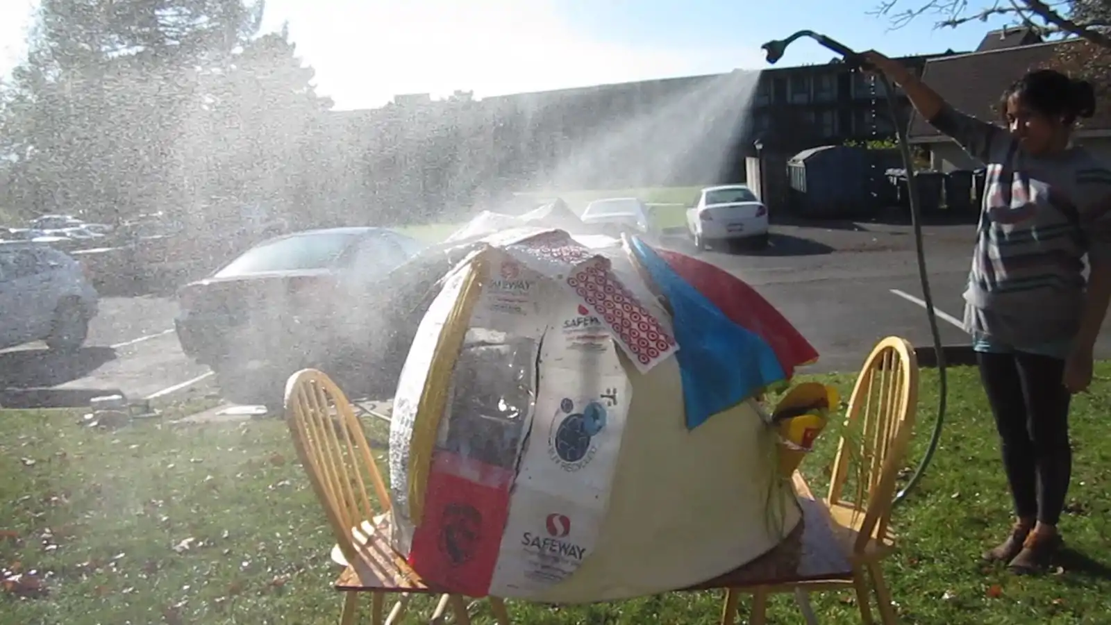 To transport the Poly Pod from Humboldt State University to its storage site, Team Apple Skins secured it to the roof of a car. This was done to take advantage of an opportunity to test for how well the Poly Pod would hold up in a windy environment. It held up well with no tearing or deformation at speeds of up to 25mph. To test for how well the Poly Pod would keep occupants dry in a rainstorm, Team Apple Skins conducted a water experiment. For this experiment, one team member was inside the unit while another used a sprinkler attachment to mimic rainfall. The three different settings utilized were: mist; cone; and shower. The team member in the unit observed that the Poly Pod leaked in the areas where there was no waterproofing seal between the solution and the frame, which was anticipated. Other leaking occurred at the door frame and at the joint of Awning Style B, where it meets the window. One more panel to the door canopy would resolve the leaking at the hinge. Weatherproofing sealant would resolve the leaking at the window.