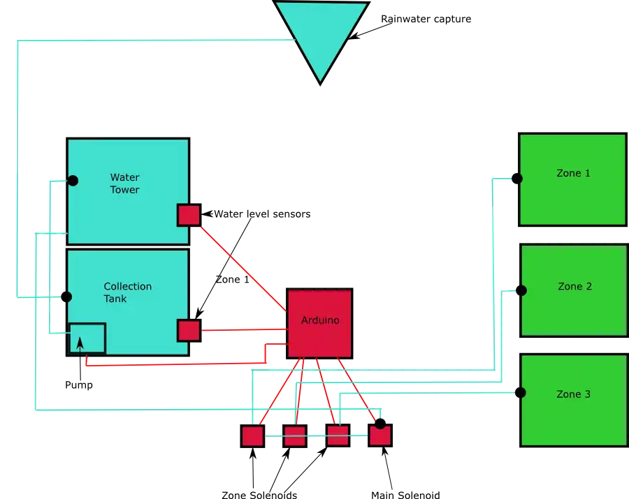 This is a two tank, gravity-fed rain water irrigation system, using Arduino as controller/timer. The system can be used for indoor or outdoor production. Bottom tank is "collection tank", top tank is "water tower". Water level sensors exist in both tanks, when collection tank has water, and water tower needs water, water will be pumped up to water tower until it is full.