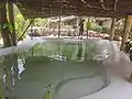 Fig 1:Natural, chlorine-free pool, with water filtered by the wetland system behind it.