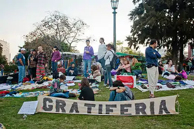 The Really, Really Free Market (RRFM) movement is a horizontally organized collective of individuals who form a temporary market based on an alternative gift economy. The RRFM movement aims to counteract capitalism in a proactive way. It holds as a major goal to build a community based on sharing resources, caring for one another and improving the collective lives of all. Markets often vary in character, but they generally offer both goods and services. Participants bring unneeded items and food, as well as skills and talents such as entertainment or haircuts. A RRFM usually takes place in an open community space such as a public park or community commons. W