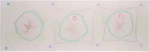 A forest garden might be designed as a repeating pattern of guilds built around individual trees. If this collection method is considered at the same time as designing the forest garden, then posts can be positioned so that they can support multiple nets for different trees (see diagram). Alternatively the trunks of adjacent trees can be used as supports for the collection nets. The nets can be moved from tree to tree as different tree species come into harvest and others finish cropping. A small clearing is also left for the collection vessel to stand in place when it is needed. A path to easily access the collection vessel is also worked into the design. To suppress weed growth in the clearing and on the path, a mulch of woodchipping is applied annually, or resilient groundcover is sown, such as white clover (will tolerate some foot traffic).