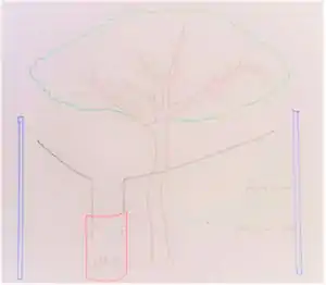 Posts are placed in the ground so that the canopy spread of the tree is encircled. A sheet or net of the same area as the posts is sourced. At the center of the net a hole is cut which matches the diameter of the trunk. A linear cut is made from this central hole to one edge of the net so that it can be fitted around the tree trunk. This cut is roughly stitched or taped back once the net is in situ. As harvest time for individual tree species approaches, the net is suspended from the posts. This is at a level above the shrub layer but below the canopy layer, probably around 1.5m to 2m from ground level.