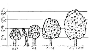 Another reason for grafting onto rootstocks is that this enables the grower to determine the tree's eventual size. Apple tree rootstocks are referred to by numbers prefixed by letters indicating the developer of the rootstock. "M" or "MM" indicate East Malling, a pioneer in the development of dwarfing rootstocks.