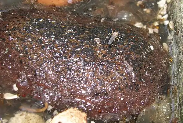 Close up photo of Culex mosquito eggs on floating Mangonut