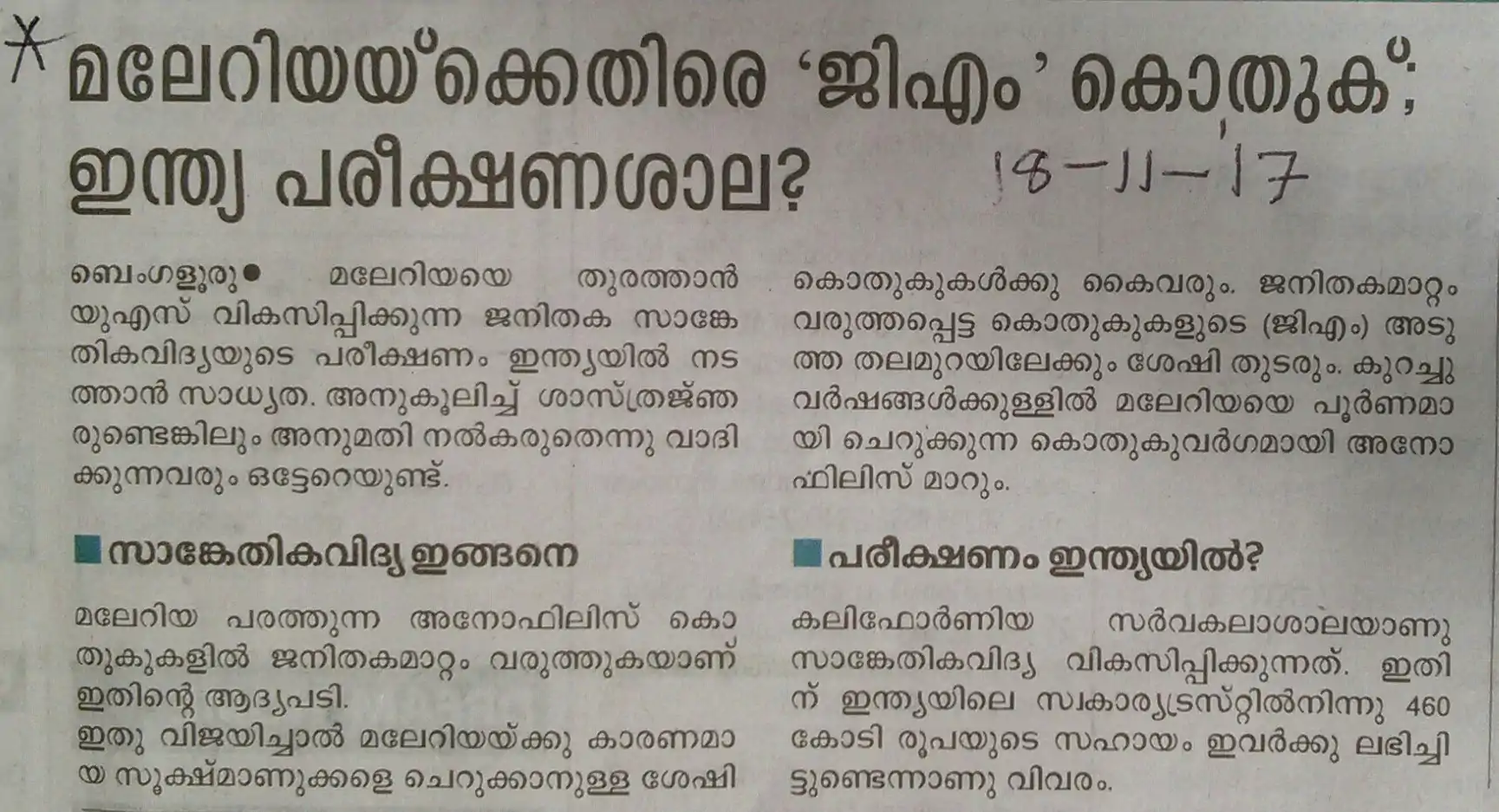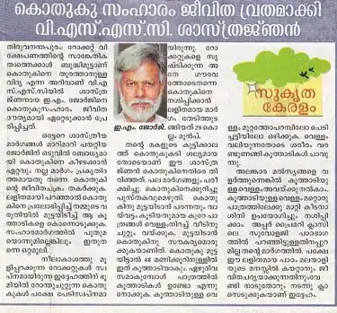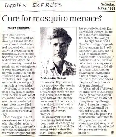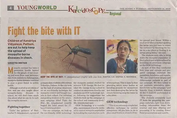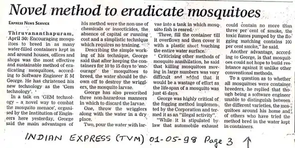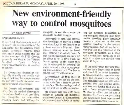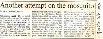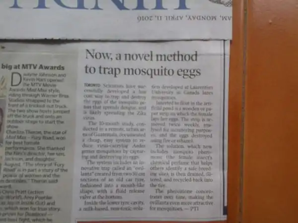 The Hindu Thiruvananthapuram (page 20, 4 Apr 2016) reported: "Now, a novel method to trap mosquito eggs"