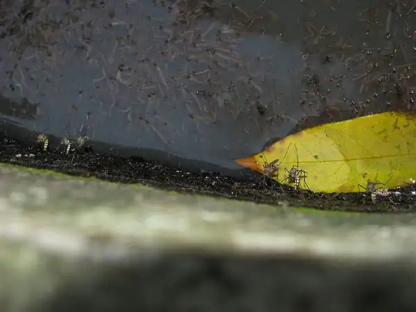 Six Culex females laying in a NON-NATURAL water-body