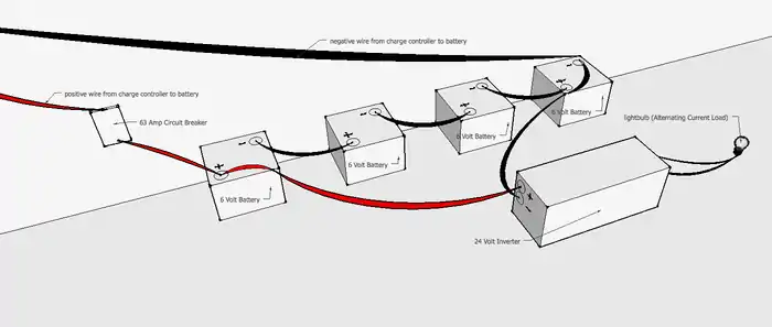 Caption - Wire the batteries together in series, then connect to the inverter.
