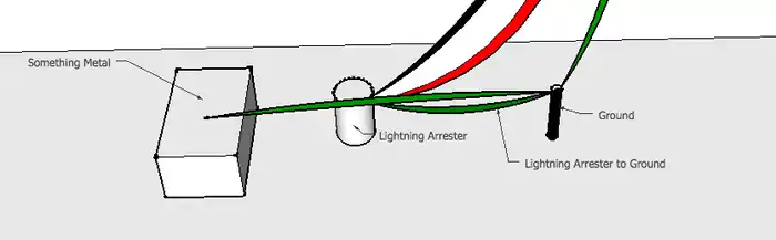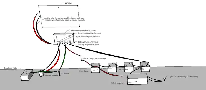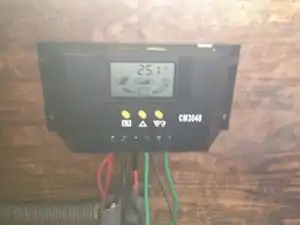 Charge ControllerThe original charge controller was replaced because it was not working. The ground fault proection was also removed because it made the system wiring more complicated. Because of the removal of the ground fault protection, the lightning arrestor was then wired with the PV positive (red) and PV negative (black) to the charge controller and the ground (green) for the lightning arrestor was wired into the battery negative.