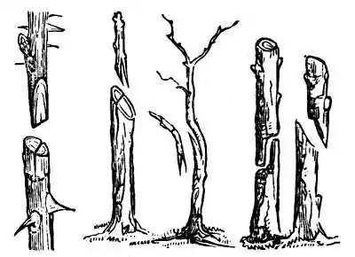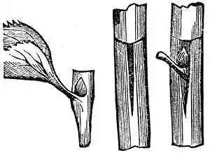 This is resorted to in the case of strong stocks, or in heading down and re-grafting old trees. The head of the stock or branch is first cut off obliquely, and then the sloped part is cut over horizontally near the middle of the slope, a cleft nearly two inches long is made with a stout knife or chisel in the crown downward, at right angles to the sloped part, taking care not to divide the pith. This cleft is kept open by the knife. The scion has its extremity for about an inch and a half, cut into the form of a wedge; it is left about the eighth of an inch thicker on the outer side, and brought to a fine edge on the inside. It is then inserted into the opening prepared for it, and the knife being withdrawn the stock closes firmly upon it.