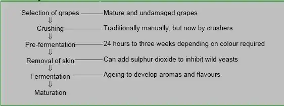 Ripe and undamaged grapes should be used. Red grapes are crushed to yield the juice plus skins, which is known as must.