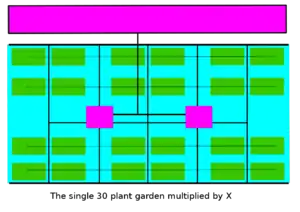 Multiple basic gardens share the same water source for an economical way to feed entire villages.