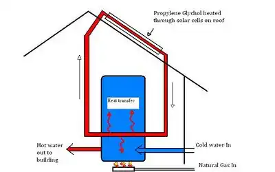- The heated propylene glycol is then circulated through a heat transfer coil specially designed to maximize surface area (therefore increasing the rate of heat transfer) which "Preheats" or warms the cold water in the tank via thermal conduction.