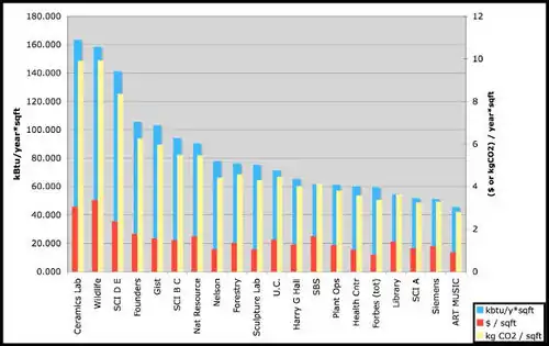 The purpose of this page is to explain how retrofits made to a building at Humboldt State University(HSU) located on B St between Laurel and 17th St in Arcata CA, http://www.humboldt.edu/humboldt/aday/documents/HSUcampusmap.pdf can reduce energy and fossil fuel consumption. Students wrote a grant proposal to the Humboldt Energy Independence Fund(HEIF) with the goal of improving energy efficiency on campus. The Sci D/E complex includes the science and engineering building as well as the greenhouse at Humboldt State University. The building (Sci D/E complex) was originally designed by Ratcliff Architects. Paul Wright and William Lowe were the contractors for the project. The idea was for a state of the art design, utilizing passive solar heating from the south and west facing windows and vents as a major architectural feature pictured above in Figure 1. As is common in the state building bidding process, the lowest bidder is awarded the project. Due to inflation and the time lapse in cost figuring, the contractor found the project funding to be insufficient, and the computer controllers for opening and closing solar heating and cooling vents were eliminated. The manual controls installed in place of the computers were ineffective. The building never cooled or heated properly, and the passive solar design proved to be primarily inefficient. Several attempts at addressing these issues have been made since 1982. The current system of cooling and heating makes the Sci D/E complex the third biggest energy user on campus with only the ceramics lab and wildlife building being higher, as shown in Figure 2. The "HVAC Efficiency Measures for Sci D/E" proposal made to HEIF by HSU engineering students addresses these costs and plans.