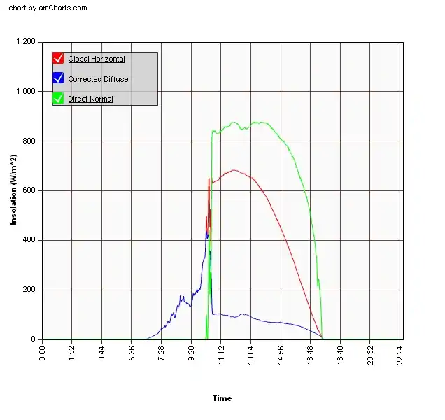 The data that SoRMS produces is collected by a Campbell Scientific CR510 data logger, and connected to the Internet using a NL-100 Network Link Interface. With this Network Link Interface, the information collected by the SoRMS project is now promptly accessible to the public as and in a Calendar View. It also allows NREL access to download SoRMS data remotely which also has a link to the data. The graphical interpretation of a day's data is shown in Fig.5.[1]