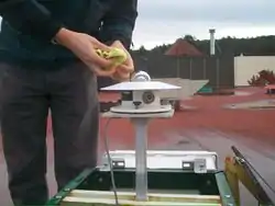 The amount of energy coming from the sun is measured with the use of an Eppley Precision Spectral Pyranometer (PSP) seen in Fig.2. This measurement is done by comparing the heat absorbed through radiation of an absorptive black surface with that of a reflective surface. There are two of these PSP’s; one is in the open sunlight and one is covered by a shadowband. The shadowband is seen bent around the PSP on the right of Fig.3, and is only blocking the direct sun light.
