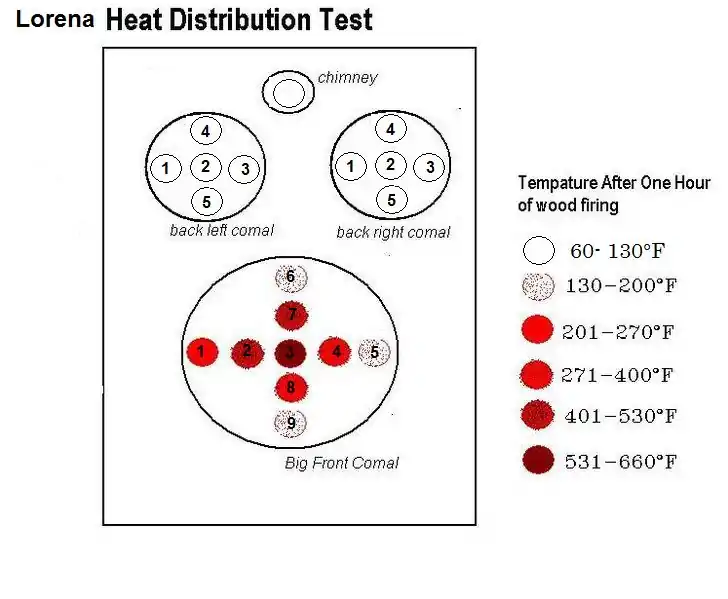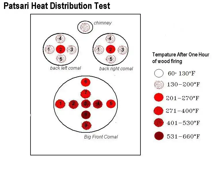 Is made of local materials of clay and sand easily accessible to the population. The stove is made of rammed earth, includes a chimney for ventilation, and sealed comals.[7]. In the village of Majamout we found that the front comal is only used for tortillas and that the comal is taken off and a grate placed on when cooking in pots. This increases the amount of smoke in the house depending on the draft of the chimney. Also, canals redirect the heat from the combustion chamber to the back comals. We found in the village of Majamout the secondary burners are not used to cook on, but rather used as warmers. With our heat distribution tests this makes sense given that even after an hour these back comals are 6 times cooler then the front comal.