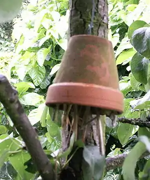 Cropping systems can be modified to favor the natural enemies, a practice sometimes referred to as habitat manipulation. Providing a suitable habitat, such as a shelterbelt, hedgerow, or beetle bank where beneficial insects can live and reproduce, can help ensure the survival of populations of natural enemies. Things as simple as leaving a layer of fallen down leaves or mulch in place provides a suitable food source for worms and provides a shelter for small insects, in turn also providing a food source for hedgehogs and shrew mice. Compost pile(s) and containers for making leaf compost also provide shelter, as long as they are accessible by the animals (not fully closed). A stack of wood may provide a shelter for voles, hedgehogs, shrew mice, some species of butterflies, ... Long grass and ponds provide shelters for frogs and toads (which themselves eat snails). Not cutting any annual or other non-hardy plants before winter (but instead in spring) allows many insects to make use of their hollow stems during winter.[1] In California prune trees are sometimes planted in grape vineyards to provide an improved overwintering habitat or refuge for a key grape pest parasitoid. The prune trees harbor an alternate host for the parasitoid, which could previously overwinter only at great distances from most vineyards. The provisioning of artificial shelters in the form of wooden caskets, boxes or flowerpots is also sometimes undertaken, particularly in gardens, to make a cropped area more attractive to natural enemies. For example, the stimulation of the natural predator Dermaptera is done in gardens by hanging upside-down flowerpots filled with straw or wood wool. Green lacewings are given housing by using plastic bottles with an open bottom and a roll of cardboard inside of it.[1] Birdhouses provide housing for birds, some of whom eat certain pests. Attracting the most useful birds can be done by using a correct diameter opening in the birdhouse (just large enough for the specific species of bird that needs to be attracted to fit through, but not other species of birds).