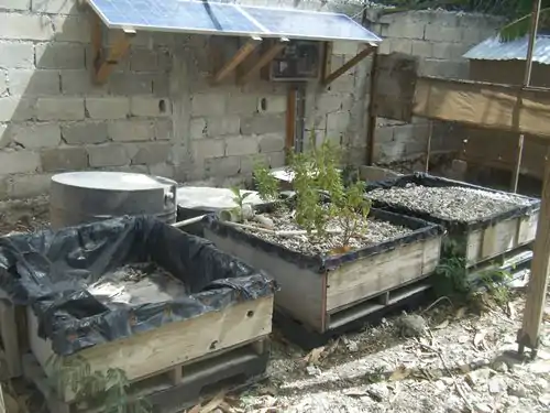 In December of 2011 Ecofficiency built an aquaponics system in Haiti Communitere. The system is comprised of three plant beds and three fish tanks, and each set of plant bed with fish tank cycled water independently of the other two. The same pump cycled water for all three systems. The system was built almost entirely out of local materials either found at Haiti Communitere or purchased nearby. Ecofficiency brought the visqueen plastic lining for the plant beds and the filters to Haiti. The plumbing was purchased at the local Eko Depot. Reclaimed wood was used to build the approximately 14 square foot plant beds. The system supported tilapia fish, and veggies like peppers and tomatoes. When Ecofficiency installed the system the pump was powered by grid electricity. Just under a year after the systems initial installation another group added a solar panel and battery system to run the pump independently of the grid. However, the panel and battery could not provide the pump with a reliable enough energy source, and the system failed. As of July 2014 the aquaponics system was not in operation.