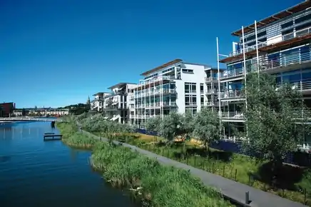 Hammarby Sjöstad is a Sustainable city located outside of Stockholm, Sweden. After Sweden faced an Oil crisis in the early 1980s, they started looking for alternative ways to produce energy for their cities. The goal of Hammarby Sjöstad is to use less than half the amount of energy used in the average Swedish home, and it looks as if they are meeting that goal. The first residents moved into the city in 2000, and when completed in 2015 they hope to have over 25,000 residents.