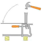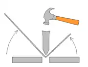 The method illustrated in Step 1 will only work well for short lengths of thin sheet metal. For longer lengths, the angles will need to be longer and will need to be clamped together at the ends - use a couple of G-clamps. For thicker sheet metal, apply force by hand to the top of the piece, then use a hammer as per Step 4.