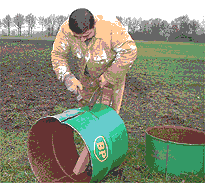 The smart trick is to drive the sharp point of an axe along a line marked on some piece of sheet metal. Only the sharp point has to cut through. Don't let the blade sink deeper into the cut, as this spoils the work. The line can be straight, make curves or make sharp angles. It only takes a little practice to follow the line with the sharp front end of the cutting edge. Fast but light hammer strokes on the flat side of the axe forces the cutting. The edge of the cut sheet bends inwards. This can be flattened, by folding it over some more, then flattening the double layer; this makes the edge stiffer, smooth, and safe for handling. A drum has strong edges made to shape the connection between the bottom and cylinder. Make good use of this reinforcement by cutting close to the edge. Cutting with the axe is easier when the sheet metal does not bend away from the cutting. But cutting free-suspending sheet metal is also easily possible by driving the axe with more horizontal hammer blows and at the same time inserting the tip of the axe at a sharper angle to the surface of the sheet metal.