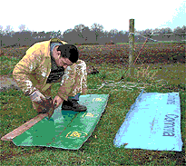 Folding sheet metal is easy. You can use almost the same method as with cutting. Hammer the axe along, but prevent making a cut, only make a linear sharp dent in the sheet. Bend over the part that has to be folded. Sometimes it helps to fold over an edge, but with some practice just applying some force with hammer blows does the job. This method of folding yields an accurate fold exactly at the line that is dented with the axe.