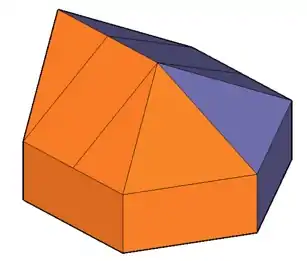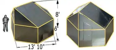 Scott Davis and Dylan Toymaker invented the H13, which solves one of the oldest quirks of the hexayurt design – how do you get a full-height doorway? Scott took a creative leap, switched around a couple of triangles, and came up with a design which for just one additional sheet of plywood gets you a structure with a full 8′ entry-way, much more interior walkable space (see below), and (subjectively) a much better over-all aesthetic. Read Dylan's October 2010 blog post for details. Vinay regards it "a fantastic piece of work", and "suspect(s) it will become a very common hexayurt in years to come". 3D sketch of Dylan's H13 of October 2010.