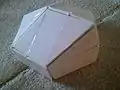 Turn the roof over so that the outside is facing upwards. Get a few more people, and tape the roof on top of the hexagonal wall-base. This should look somewhat like: