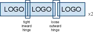 The drawing above is showing the logo’ed sides of the panels, and thus is the view from the inside when the left-most panel is attached to the right-most panel. The tight hinges are taped from the inside first (with no gap), which means the logo’ed sides close on each other. The loose hinges are taped from the outside first with a gap equal to the thickness of your panels. For the loose hinged edges, the non-logo’ed sides will close on each other so that another panel can be placed in between. This gap ensures that these hinges can also partially turn inside to form one of the vertices of the hexagon. Repeat this step twice to get two half-wall pieces. Optionally, you can combine all six wall-panels with alternating tight inward hinges and loose outward hinges, too. This option will lead to less taping on site, but it will also create a quite bulky single-wall piece.