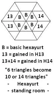 The (currently theoretical) H14, which uses 14 panels to put the same "gable" shape as the H13 on both sides of the hexayurt, has even more standing room: more than twice the available standing room of the good old H12.