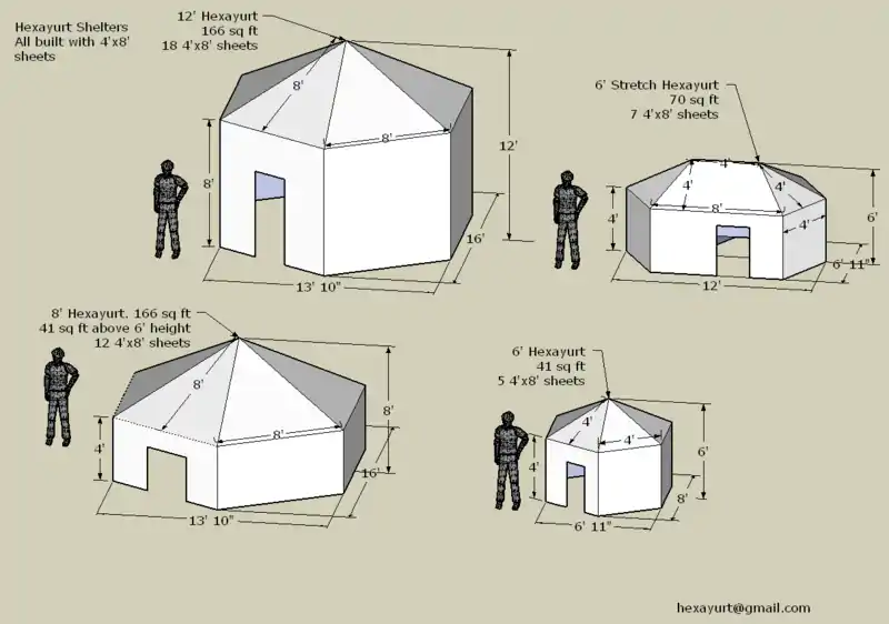 - Make the decision. Review the materials on the site, and if it's looking good, decide. Consider a semi-folding hexayurt made with simple hinges: Hexayurt_Camp_Danger_two_part_folding: they are pre-fabricated with the same materials described here, and most of the work is done at home. For the comparison of different size/shape yurts, click: Hexayurt_playa#Which_Hexayurt.3F