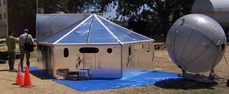 Note: hexayurts, once taped together, are large, lightweight, fragile things that will catch the wind like a sail, and blow away like a kite. Be prepared to stake your hexayurt to the ground before you tape the roof onto the walls. Consider driving 3 stakes into the ground and have some rope ready. While the probability of a rogue dust storm during hexayurt construction might seem low, it can happen and has happened. Do not lose your hexayurt this way.